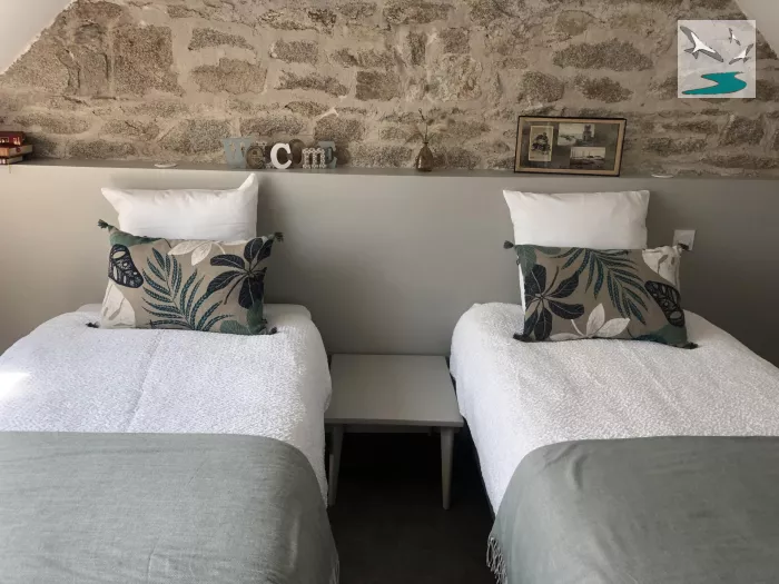 A l’étage, vous trouverez pour vos douces nuits deux grandes chambres et une salle d’eau avec WC. L’une des chambres est équipée d’un lit double 160X200 et l’autre de deux lits simples 90X190. Ces deux couchages peuvent être rapprochés pour n’en former qu’un seul si besoin. Deux couples peuvent donc facilement séjourner dans les lieux.